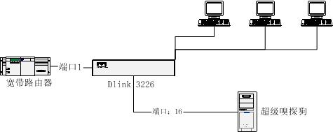 用超級(jí)嗅探狗局域網(wǎng)監(jiān)控軟件實(shí)現(xiàn)網(wǎng)絡(luò)監(jiān)控,需要把安裝超級(jí)嗅探狗的電腦接到交換機(jī)的“鏡像端口”上面。本例將以D-Link3226交換機(jī)為例,介紹如何通過(guò)D-Link3226交換機(jī)來(lái)實(shí)現(xiàn)局域網(wǎng)網(wǎng)絡(luò)監(jiān)控管理。此例也同樣適用于D-Link的其他支持端口鏡像的交換機(jī)。