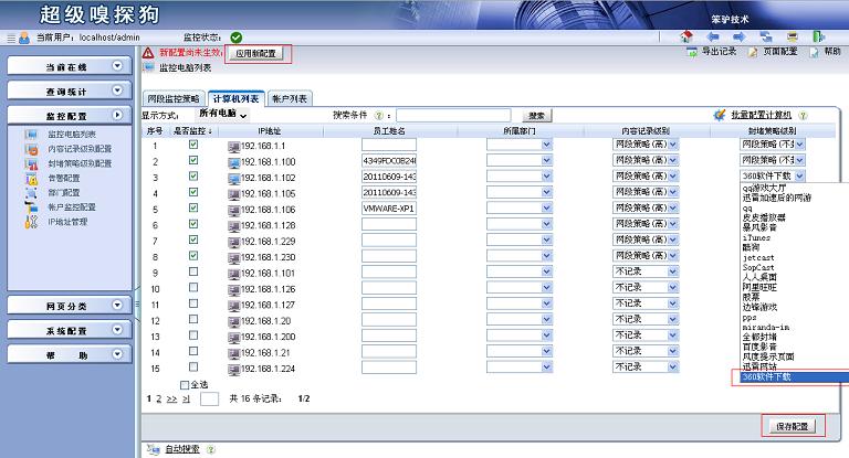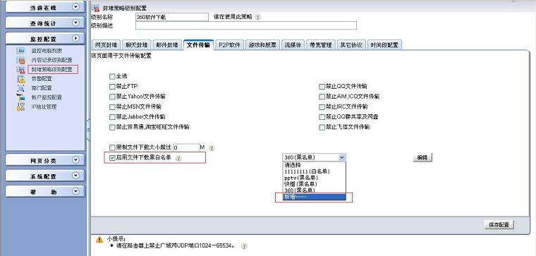 3. 后退后再次“保存配置”,在監控電腦列表中為相應的電腦選擇剛才設定好的封堵策略,保存配置,應用新配置。