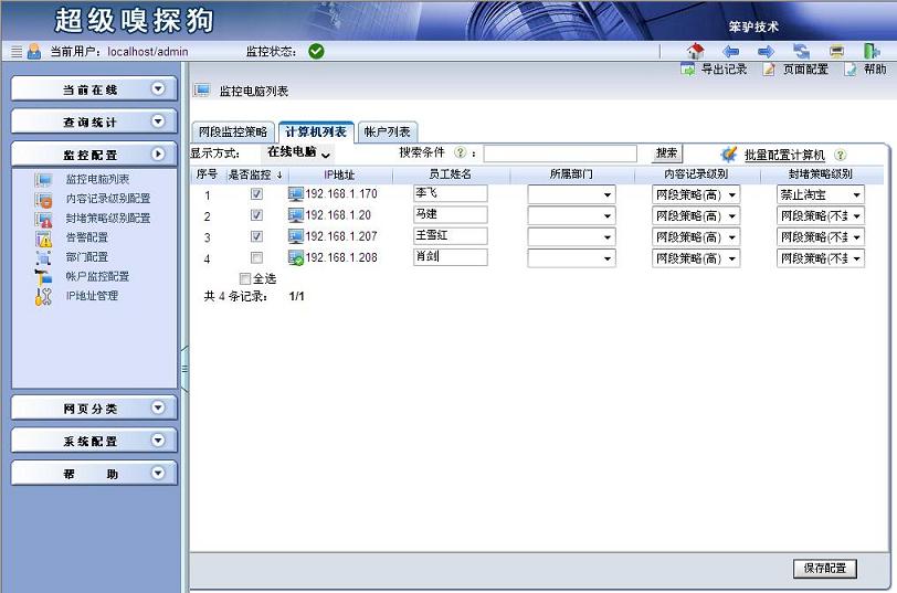 步驟四:選擇監(jiān)控配置->監(jiān)控電腦列表,進(jìn)入“監(jiān)控電腦列表”界面,點擊“計算機列表”選項卡,為計算機設(shè)置封堵策略級別。具體如下圖所示: