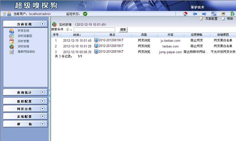 步驟六:選擇當(dāng)前在線->實時封堵,進(jìn)入“實時封堵”界面,可以看到已經(jīng)被禁止訪問的網(wǎng)站的記錄。具體如下圖所示: