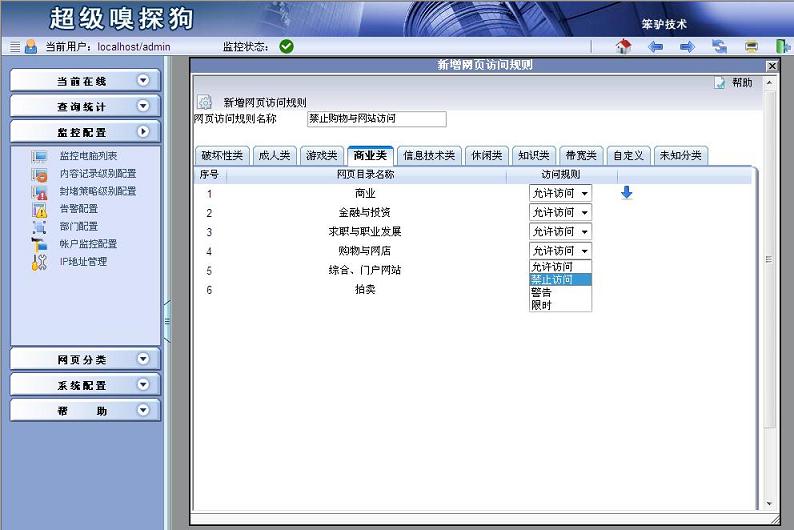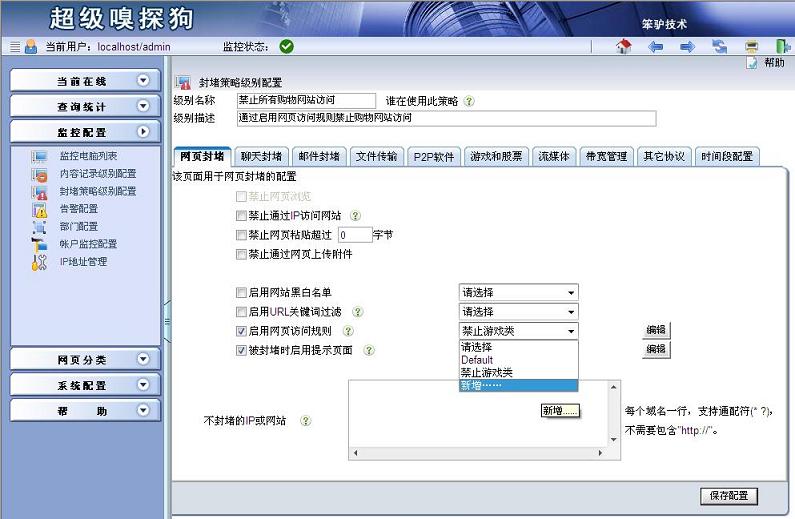 步驟二:彈出“新增網(wǎng)頁訪問規(guī)則”,輸入“網(wǎng)頁訪問規(guī)則名稱”,點擊“商業(yè)類”選項卡,在“購物與網(wǎng)店”后的下拉列表中選擇“禁止訪問”。點擊“保存配置”。具體如下圖所示: