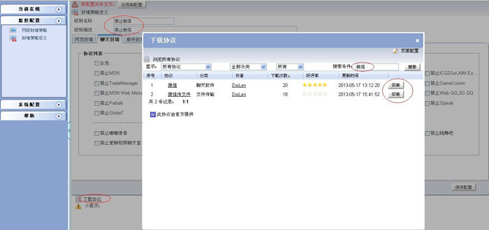 新建一個(gè)封堵策略,名為“禁止微信”。點(diǎn)擊左下方的“下載協(xié)議”,彈出“下載協(xié)議”框,搜索微信和微信傳文件并安裝。