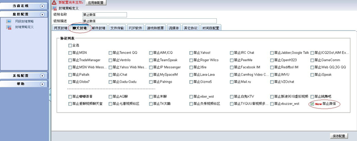 選擇“聊天封堵”,將“禁止微信”前面的勾勾上,然后選擇“文件傳輸”,將“禁止微信傳文件”前面的勾勾上,點(diǎn)擊保存配置。