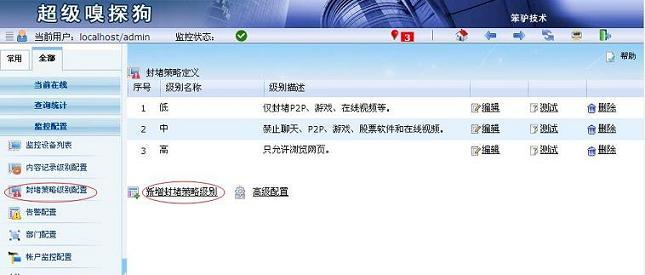 打開WFilter 進(jìn)入到“監(jiān)控配置” -- “封堵策略級(jí)別配置”,點(diǎn)擊“新增封堵策略級(jí)別”。