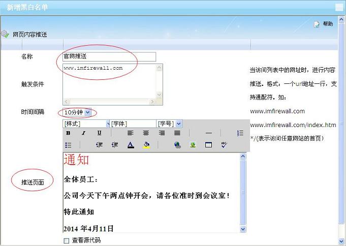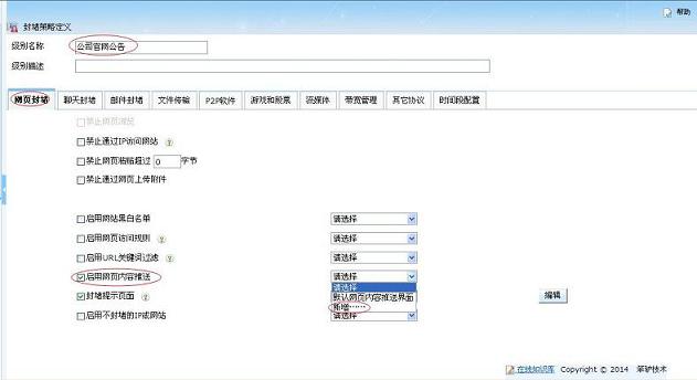 輸入級(jí)別名稱以及級(jí)別描述,(如:公司官網(wǎng)通知),選中網(wǎng)頁(yè)封堵選項(xiàng)卡,選擇“啟用網(wǎng)頁(yè)推送” ,點(diǎn)擊新增。