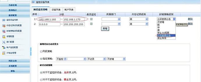 進(jìn)入到監(jiān)控配置 -- 網(wǎng)段封堵策略,點(diǎn)擊新增,輸入想要封堵的網(wǎng)段如:192.168.1.160-192.168.1.170 ,封堵級(jí)別選擇新增的“公司官網(wǎng)通知”。