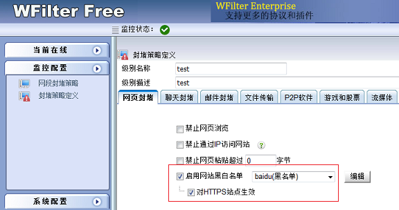 如圖所示,啟用網站黑白名單,并且勾選“對HTTPS站點生效”,即可禁止黑白名單中的站點。不管是HTTP還是HTTPS站點都將被禁止掉。