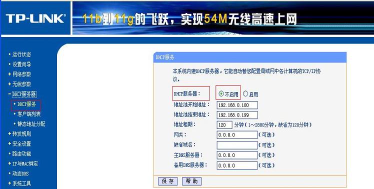 因為有線路由器已經有了DHCP服務,所以需要把無線路由器的DHCP服務關閉掉。
