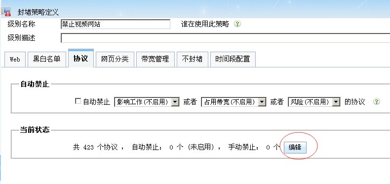1.首先,您需要在監控配置->封堵策略級別配置中,新增一個封堵策略級別,在協議選項卡中,點擊“編輯”。具體如下圖所示: