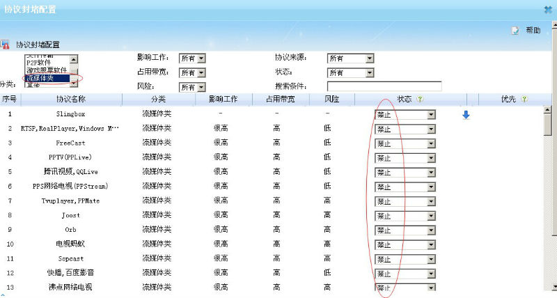2.在協議封堵配置中,選擇“流媒體”分類,將顯示的第一個協議選為禁止后,點擊向下的箭頭,就可以將該分類全部設為禁止,如圖所示: