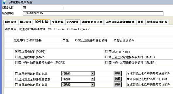 對于客戶端郵件,可以選擇"郵件封堵"標簽,具體可以配置禁止收發以及黑白名單過濾(參考網站黑白名單配置用例)等.如圖: