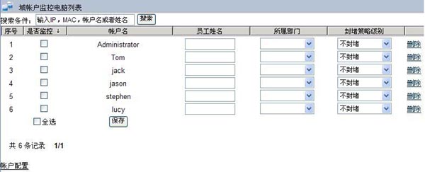 如圖1.3所示,點擊“保存并獲取域帳戶”,進入“域帳戶監控列表”頁面,可以對列表中的帳戶指定不同的上網策略。