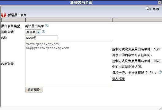 1. 在“監控配置 -> 黑白名單配置”新增一個屏蔽QQ農場的網站黑名單,如下圖所示: