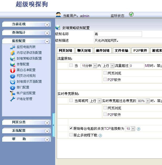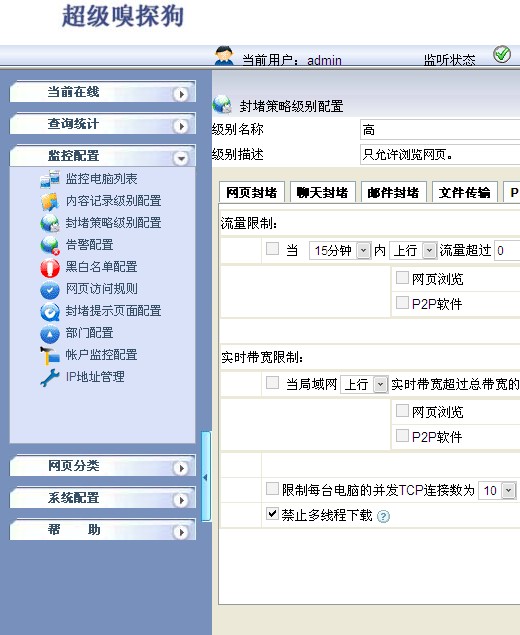 (1)打開超級嗅探狗,在“封堵策略級別配置”里面,編輯選擇“禁止電驢”,然后點擊保存配置。具體操作如下圖所示: