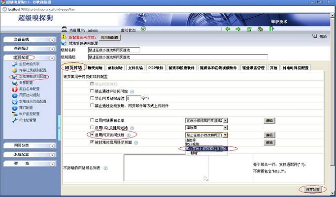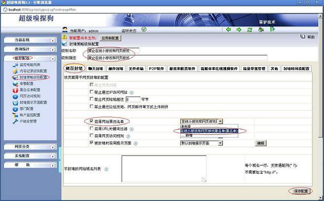 (2)打開超級嗅探狗,在“監(jiān)控配置-- >封堵策略級別配置-- >編輯-- >禁止在線小游戲和網(wǎng)頁游戲”,配置如下如所示: