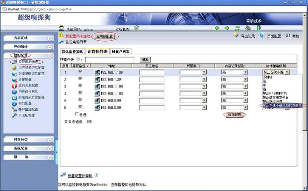 (3)在“監(jiān)控配置-- >監(jiān)控電腦列表-- >計算機列表”中應用封堵規(guī)則,如下圖所示:
