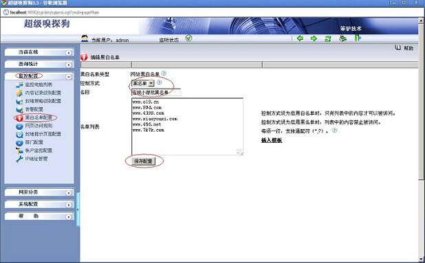 (1)打開超級嗅探狗,在“監(jiān)控配置-- >黑白名單配置-- >新增網(wǎng)站黑名單:在線小游戲黑名單”,配置如下如所示: