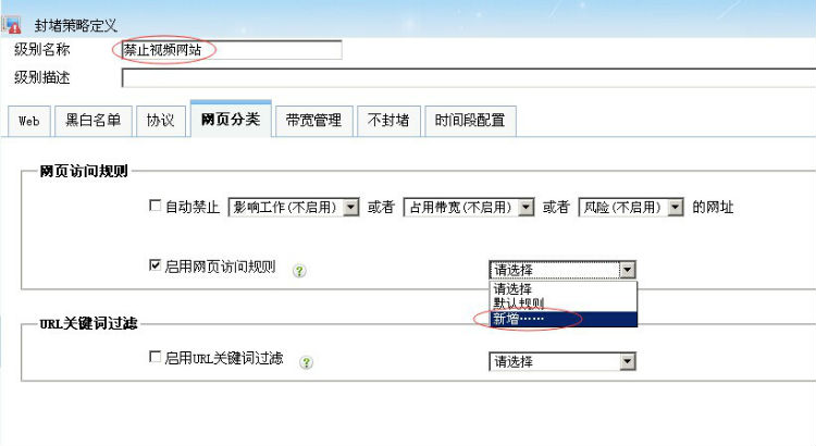 1.首先,您需要在監(jiān)控配置->封堵策略級別配置中,新增一個封堵策略級別,在網頁分類選項卡中,勾選“啟用網頁訪問規(guī)則”,并在后面的下拉列表中,點擊“新增”,并保存配置。具體如下圖所示: