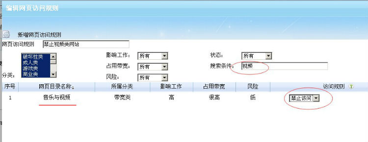 2.彈出的“編輯網頁訪問規(guī)則”界面,搜索“視頻”,將音樂與視頻設為禁止訪問,并保存配置。具體如下圖所示: