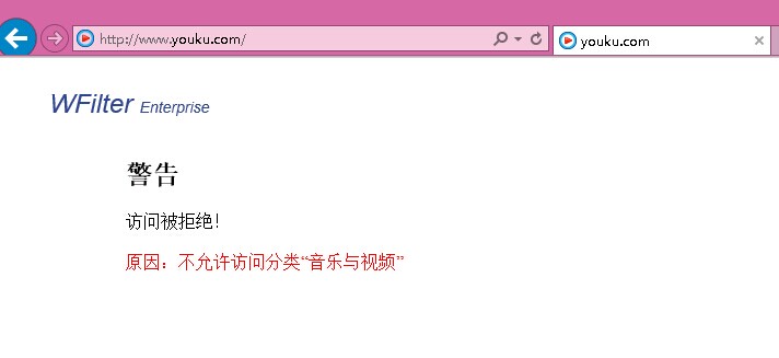 4.當被實施該封堵的電腦訪問您所禁止的視頻網站時,會出現(xiàn)以下封堵頁面: