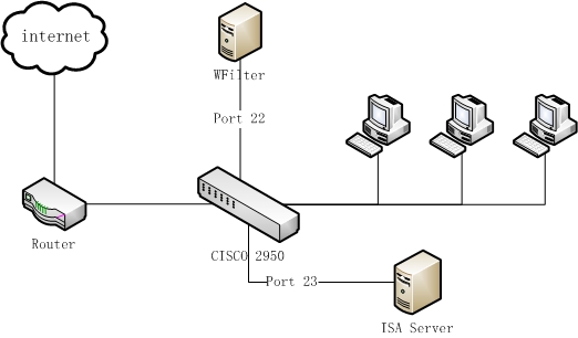 An office uses ISA server 2004 as the proxy server, with a cisco 2950 switch as the central switch. The network topology diagram: