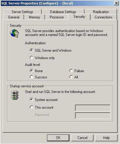 As in Figure 4.1, open the "Enterprise Manager", right click the database server name and click "Properties", then set authentication to "SQL Server and Windows" in the "Security" tab.